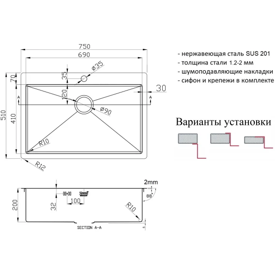 Кухонная мойка Zorg ZL R 750510 75x51 см, нержавеющая сталь