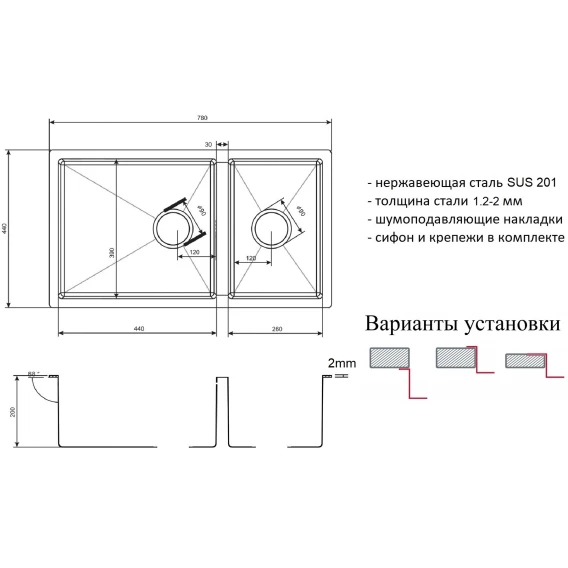 Кухонная мойка Zorg ZL R 780-2-440 GRAFIT 78x44 см, графит