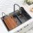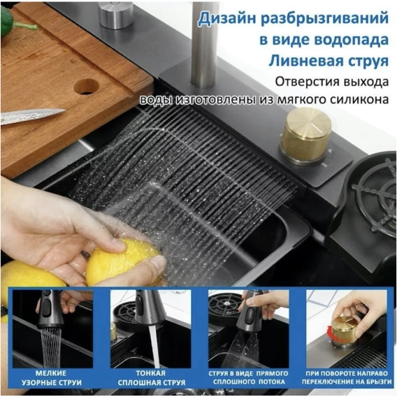 • Многофункциональный Смеситель в цвет мойки с функцией водопад и выдвижной лейкой с режимами струя/душ/мойка, управление включением/выключением воды и настройкой температуры осуществляется одной ручкой.