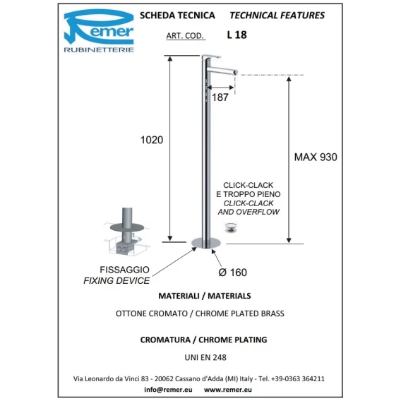 Смеситель напольный для раковины с донным клапаном Remer Class Line L18