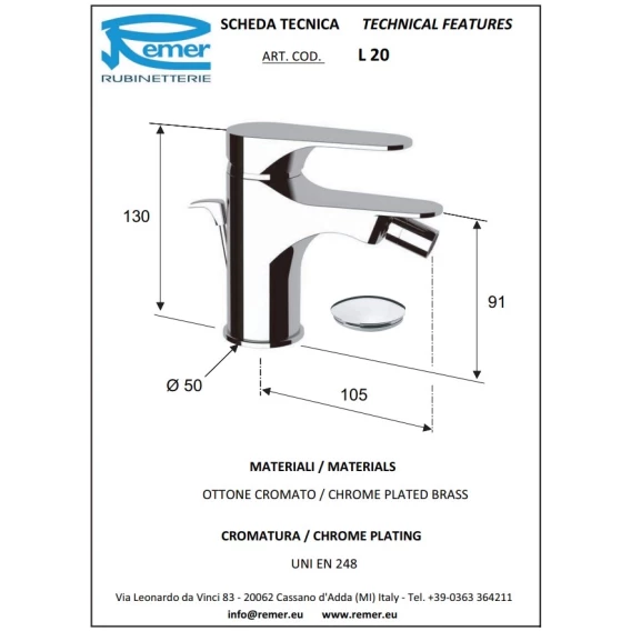 Смеситель для биде с донным клапаном Remer Class Line L20
