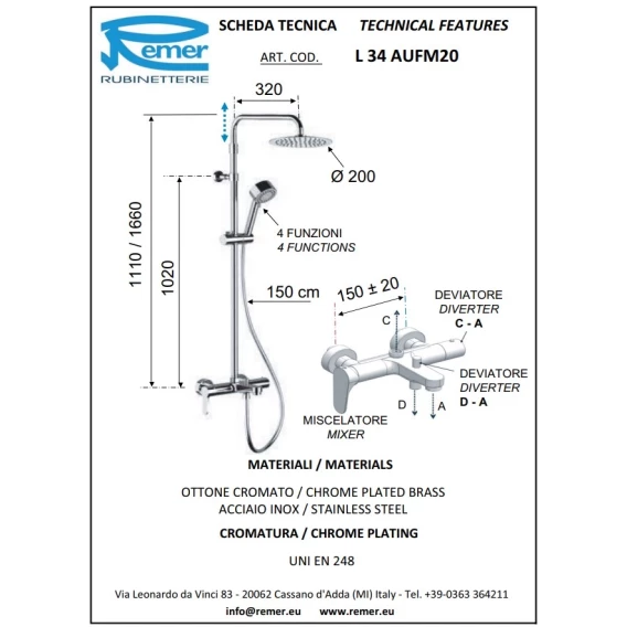Душевая система 200 мм Remer Class Line L34AUFM20