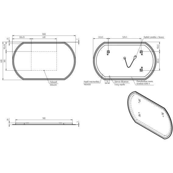 Крепление, LED подсветка, Сенсорный выключатель, Функция анти-пар, Вилка