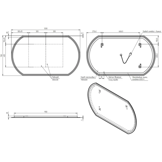 Крепление, LED подсветка, Сенсорный выключатель, Функция анти-пар, Вилка