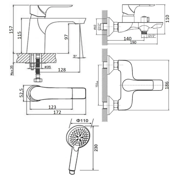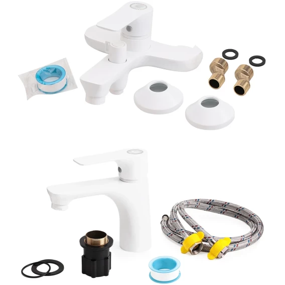 Крепление, Аэратор, Гибкая подводка, Металлическая розетка, Эксцентрики, Душевой шланг, Душевая лейка, Держатель для душевой лейки, Смеситель
