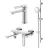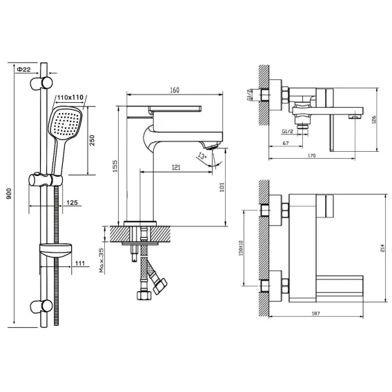 Крепление, Аэратор, Гибкая подводка, Металлическая розетка, Эксцентрики, Душевой шланг, Душевая лейка, Держатель для душевой лейки, Смеситель, Мыльница, Штанга душевая