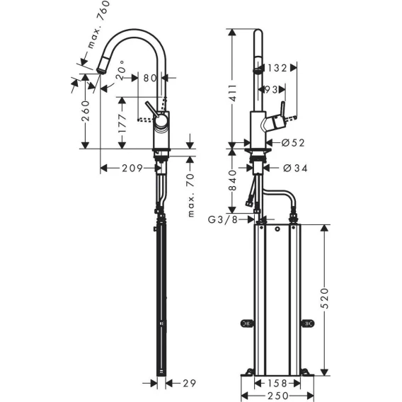 •установка перед окном, смеситель складывается, высота основания смесителя 70 мм