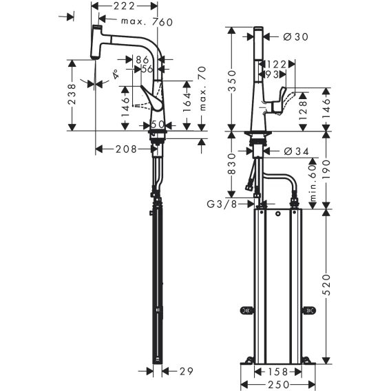 • угол поворота излива: регулировка на 2 уровня, на 110° или 150°