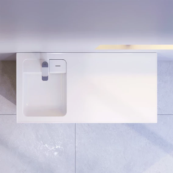 Подходит для интеграции с узкими стиральными машинами (глубиной от 32 до 45 см). Дизайнерская раковина из литьевого мрамора белоснежного цвета с бортиком, скрытым сливом и съемной мыльницей. Раковина оснащена просторной столешницей, на которой можно разместить косметические и гигиенические средства. Столешница защищает стиральную машину от повреждений и механических воздействий.