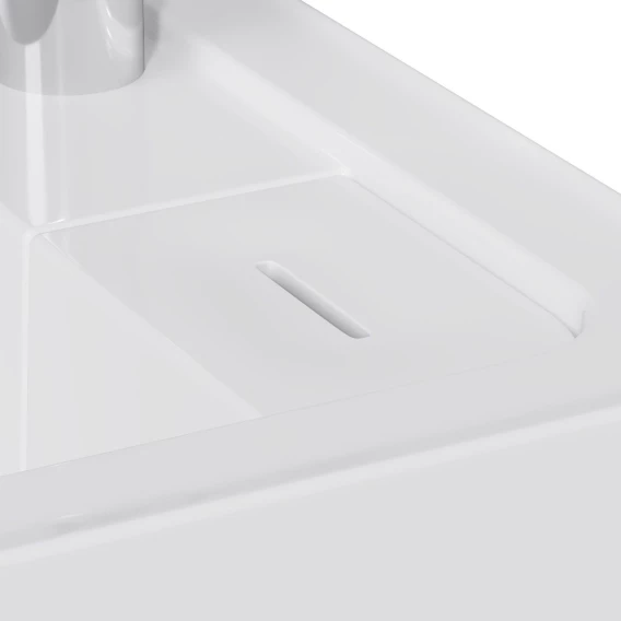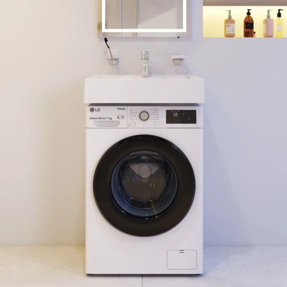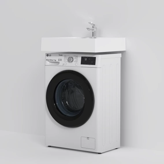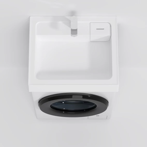 Подходит для интеграции с узкими стиральными машинами (глубиной от 32 до 38 см). Дизайнерская раковина из литьевого мрамора белоснежного цвета с бортиком, скрытым сливом и съемной мыльницей. Устанавливается непосредственно над стиральной машиной.