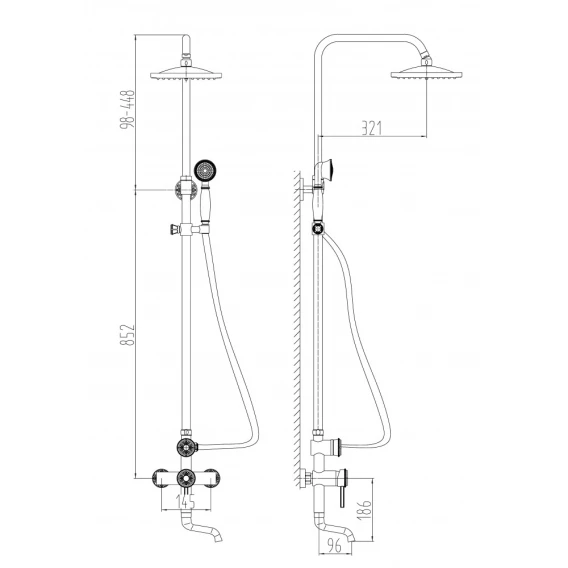 Аэратор, Металлическая розетка, Эксцентрики, Душевой шланг, Душевая лейка, Держатель для душевой лейки, Верхний душ, Смеситель, Кронштейн, Штанга душевая