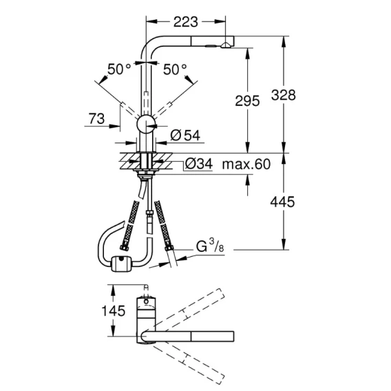 • профессиональная выдвижная лейка с переключателем аэратор/душевая струя