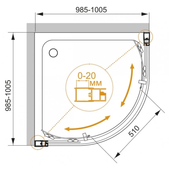Габариты с диапазоном регулировок, мм: (985-1005)х(985-1005)х1950