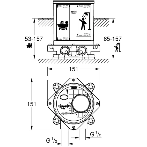• инсталляционная глубина для смесителей для душа 65-157 мм, компенсационная глубина 92 мм