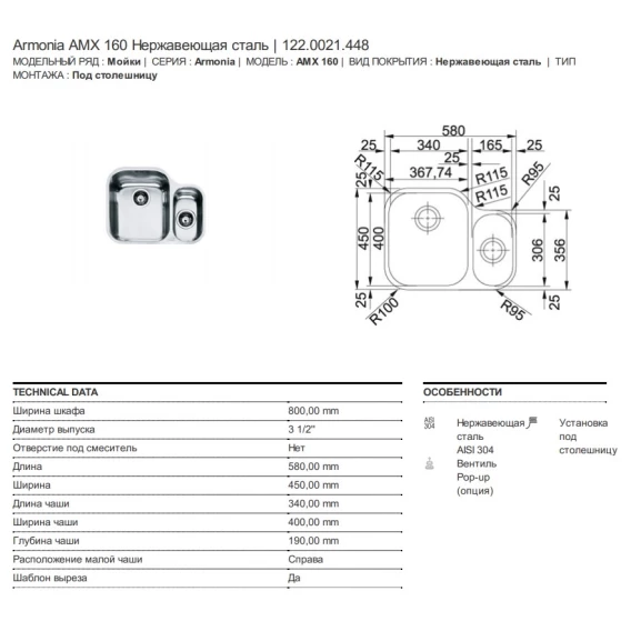 Кухонная мойка Franke Armonia AMX 160 полированная сталь 122.0021.448