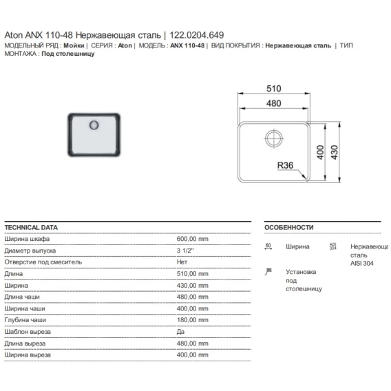 Кухонная мойка Franke Aton ANX 110-48 полированная сталь 122.0204.649