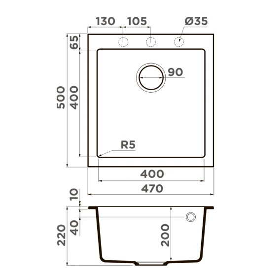 Намеченных отверстий для смесителя