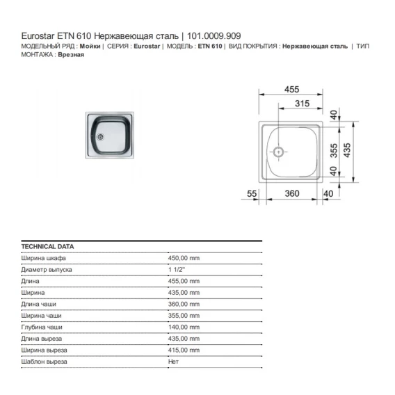 Кухонная мойка Franke Eurostar ETN 610 матовая сталь 101.0009.909