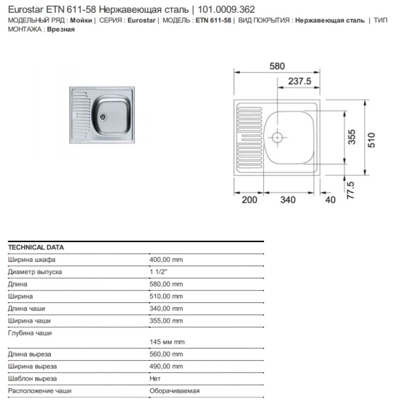 Кухонная мойка Franke Eurostar ETN 611-58 матовая сталь 101.0009.362