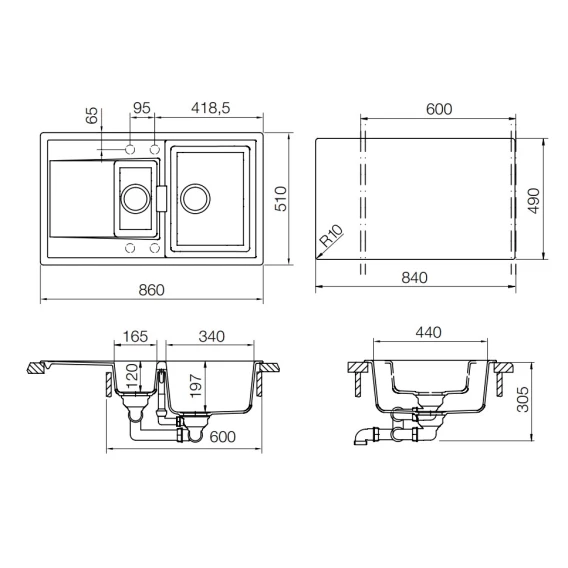 • Отводная арматура с клапаном-автоматом 3 ½" и переливом для основной чаши