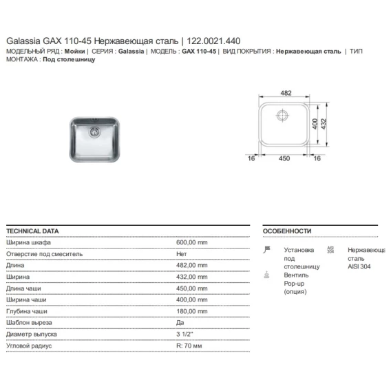 Кухонная мойка Franke Galassia GAX 110-45 полированная сталь 122.0021.440