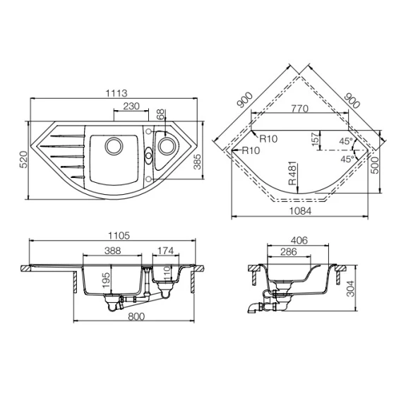 • Отводная арматура с клапаном-автоматом 3 ½" и переливом для одной чаши