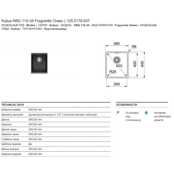 Кухонная мойка Franke Kubus KBG 110-34 оникс 125.0176.637