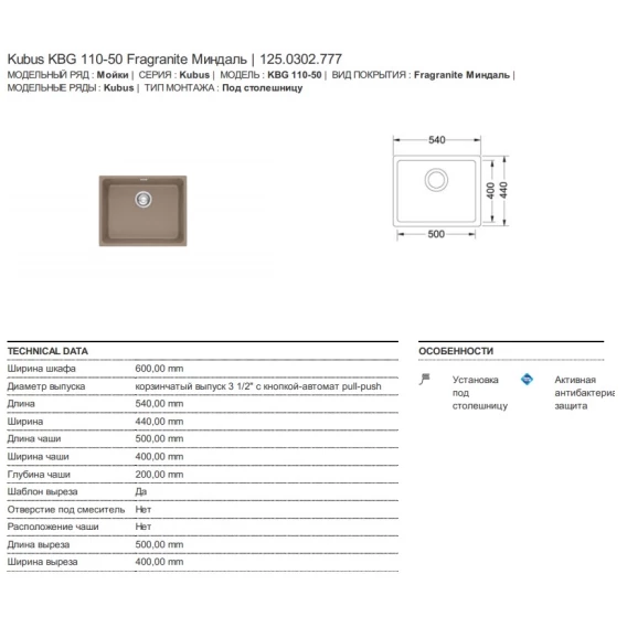 Кухонная мойка Franke Kubus KBG 110-50 миндаль 125.0302.777