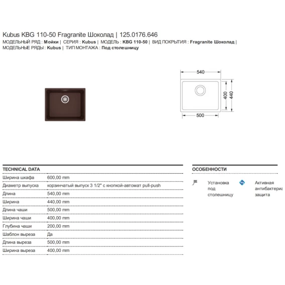Кухонная мойка Franke Kubus KBG 110-50 шоколад 125.0176.646
