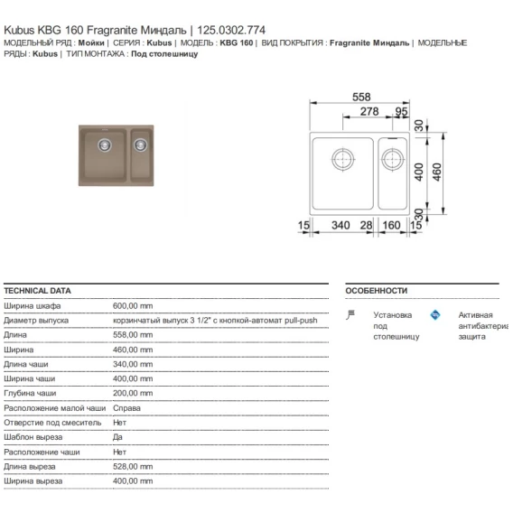 Кухонная мойка Franke Kubus KBG 160 миндаль 125.0302.774