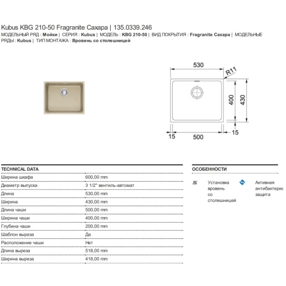 Кухонная мойка Franke Kubus KBG 210-53 сахара 135.0339.246