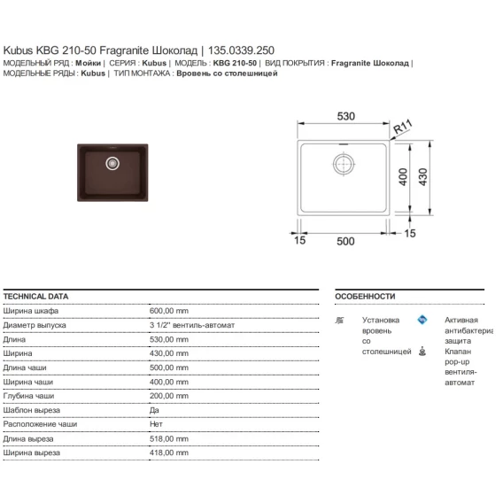 Кухонная мойка Franke Kubus KBG 210-53 шоколад 135.0339.250