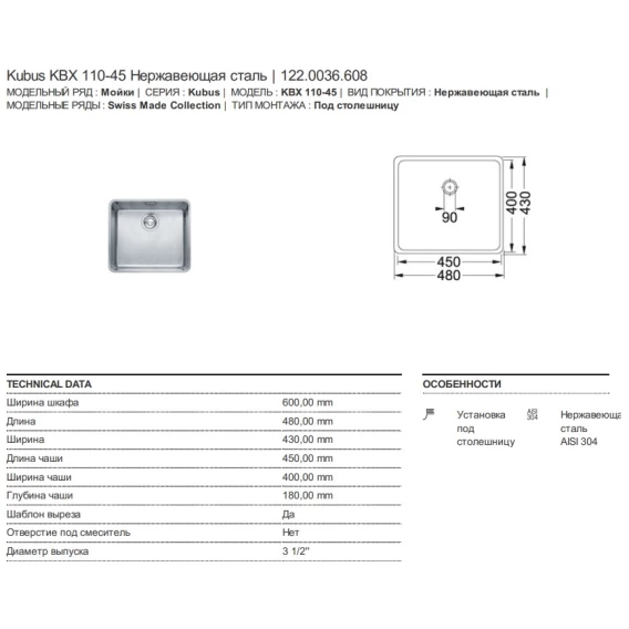 Кухонная мойка Franke Kubus KBX 110-45 полированная сталь 122.0036.608