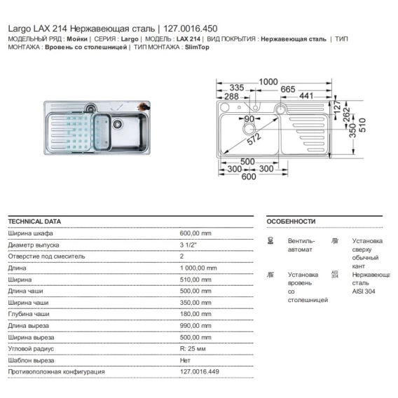 Кухонная мойка Franke Largo LAX 214 полированная сталь 127.0016.450