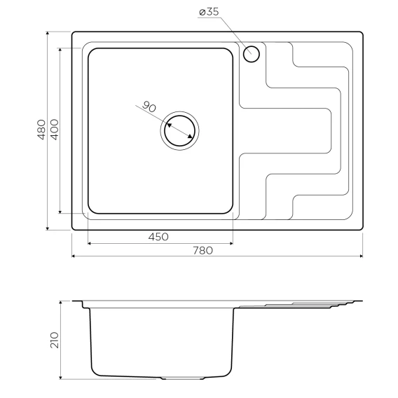• Размер выреза под мойку при монтаже под столешницу: 760х460 мм., угловой радиус врезки 10 мм.