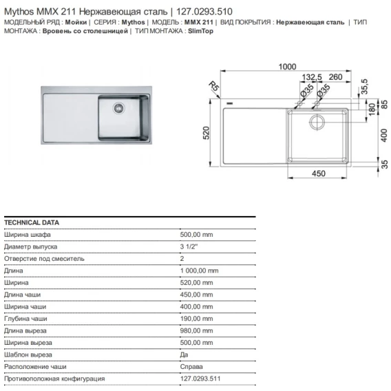 Кухонная мойка Franke Mythos MMX 211 полированная сталь 127.0293.511