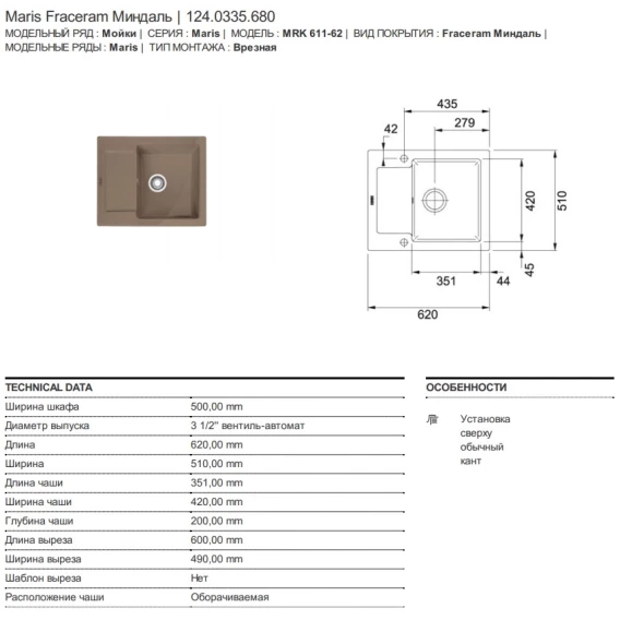 Кухонная мойка Franke Maris MRK 611-62 миндаль 124.0335.680