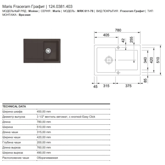 Кухонная мойка Franke Maris MRK 611-78 графит 124.0381.403