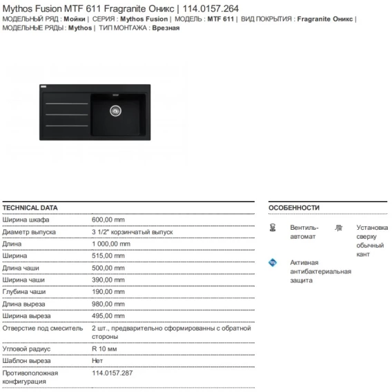 Кухонная мойка Franke Mythos Fusion MTF 611 оникс 114.0157.264