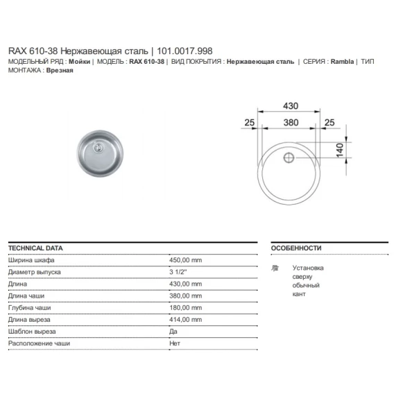 Кухонная мойка Franke Rambla RAX 610-38 полированная сталь 101.0017.998