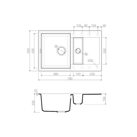 • Вырез под мойку: 760x480 мм.