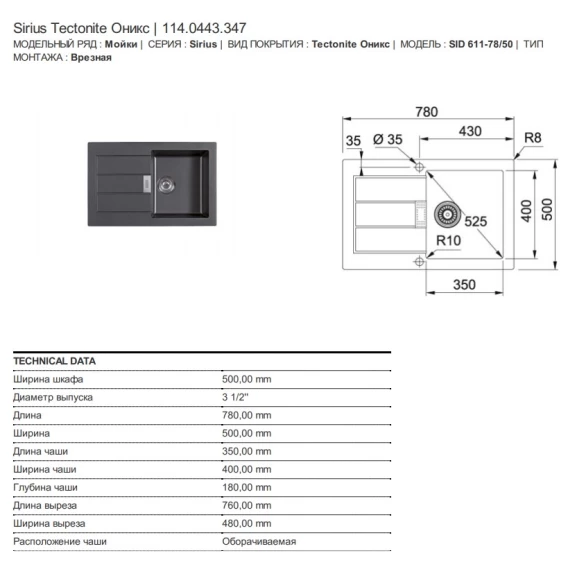 Кухонная мойка Tectonite Franke Sirius SID 611-78 оникс 114.0443.347