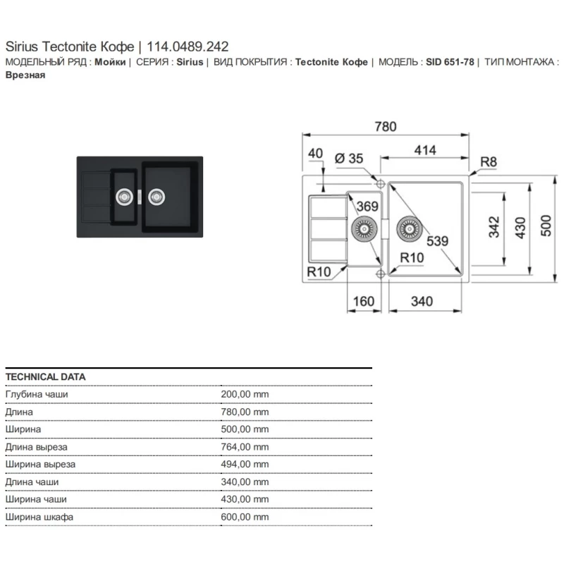 Кухонная мойка Tectonite Franke Sirius SID 651-78 оникс 114.0489.242