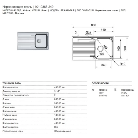 Кухонная мойка Franke Smart SRX 611-86 полированная сталь 101.0368.249