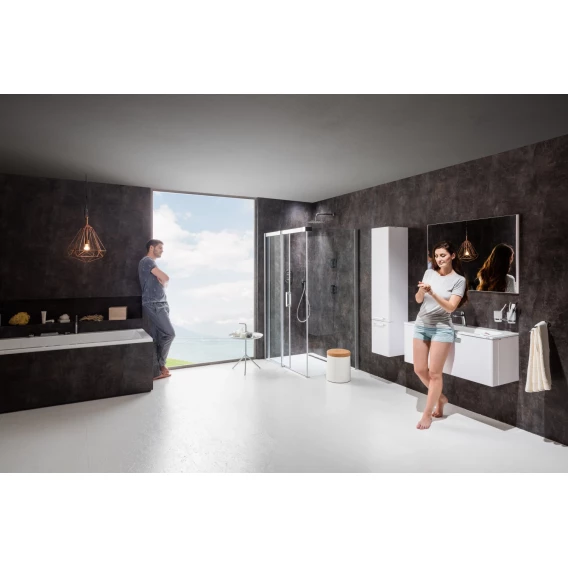Изделие состоит из двухэлементных душевых дверей (одна неподвижная часть и одна подвижная часть, образующая раздвижные двери) и одноэлементной неподвижной стенки. Левый или правый варианты открывания дверей определяются тем, на какой стороне, при виде снаружи, находятся петли. Устанавливается в облицованный кафелем угол ванной комнаты на поддоны Perseus Pro Chrome, Gigant Pro Chrome или непосредственно на пол со встроенным душевым каналом или трапом.