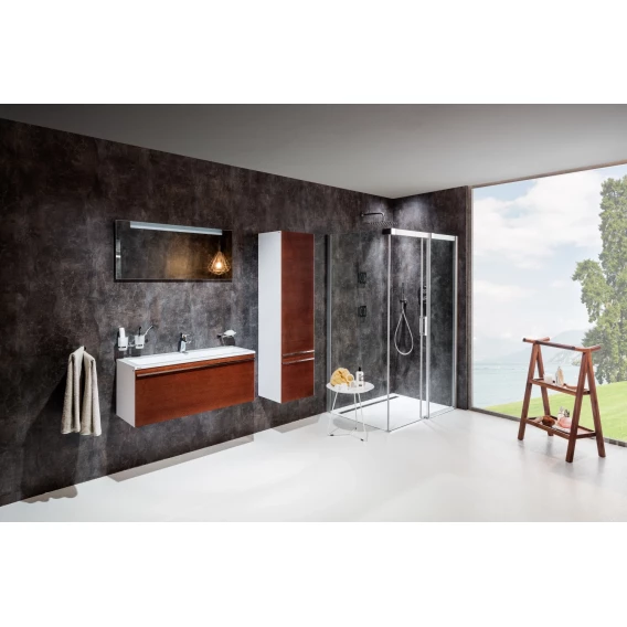Изделие состоит из двухэлементных душевых дверей (одна неподвижная часть и одна подвижная часть, образующая раздвижные двери) и одноэлементной неподвижной стенки. Левый или правый варианты открывания дверей определяются тем, на какой стороне, при виде снаружи, находятся петли. Устанавливается в облицованный кафелем угол ванной комнаты на поддоны Perseus Pro Chrome, Gigant Pro Chrome или непосредственно на пол со встроенным душевым каналом или трапом.