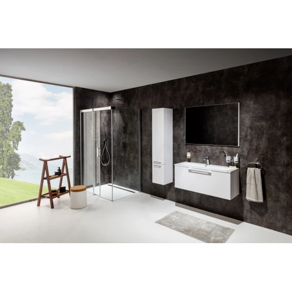 Изделие состоит из двухэлементных душевых дверей (одна неподвижная часть и одна подвижная часть, образующая раздвижные двери) и одноэлементной неподвижной стенки. Левый или правый варианты открывания дверей определяются тем, на какой стороне, при виде снаружи, находятся петли. Устанавливается в облицованный кафелем угол ванной комнаты на поддоны Perseus Pro Chrome, Gigant Pro Chrome или непосредственно на пол со встроенным душевым каналом или трапом.