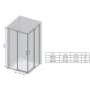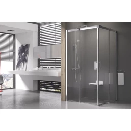 Изделие состоит из двух ровных неподвижных частей и двух ровных подвижных частей, образующих раздвижные двери. Устанавливается в облицованный кафелем угол ванной комнаты на поддоны RAVAK Perseus Pro Chrome или непосредственно на пол со встроенным душевым каналом.