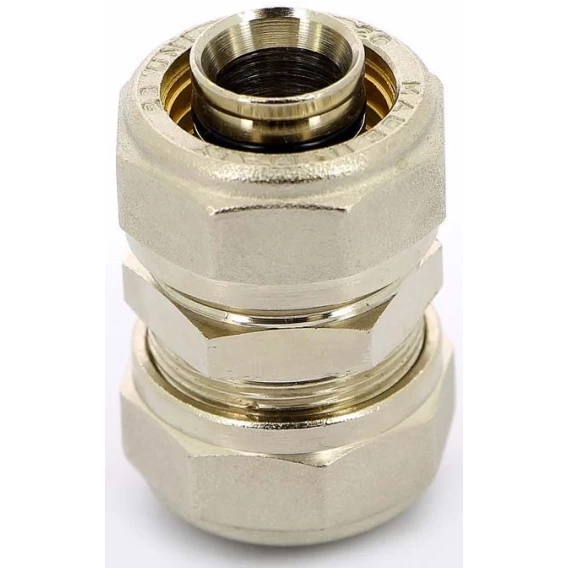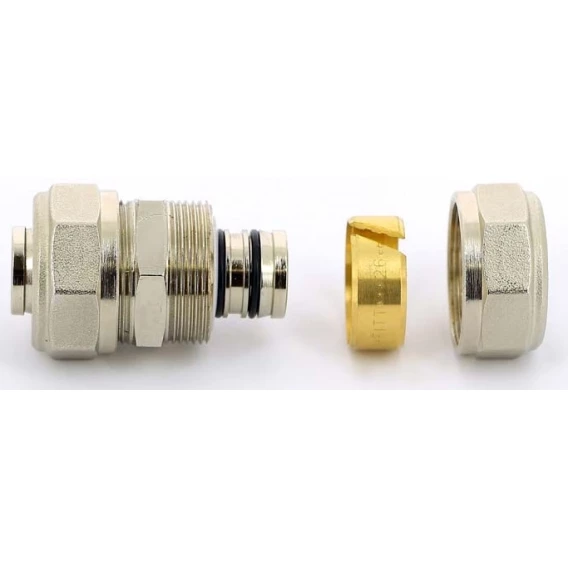 Монтаж обжимных фитингов следует производить в соответствии с требованиями СП 40-102-2000;СП 41-102-98; СП 40-103-98 и СНиП 3.05.01-85.При монтаже системы следует придерживаться следующего порядка:• отрезать металлопластиковую трубу нужной длины, строго перпендикулярно оси трубы;• подготовить трубу к монтажу фитинга (откалибровать трубу и снять внутреннюю фаску);• одеть на трубу гайку и обжимное кольцо (цангу);• вставить до упора штуцер фитинга в трубу, не повредив уплотнительных колец;• пододвинуть к корпусу фитинга обжимное кольцо;• накрутить от руки гайку на фитинг;• с помощью двух ключей соответствующего размера затянуть гайку на фитинге.Для качественного монтажа следует соблюдать следующие усилие затяжки ключами:• для фитингов d16 – 11/4 оборота гайки после затяжки от руки;• для фитингов d20-26 – 1 оборот гайки после затяжки от руки.
