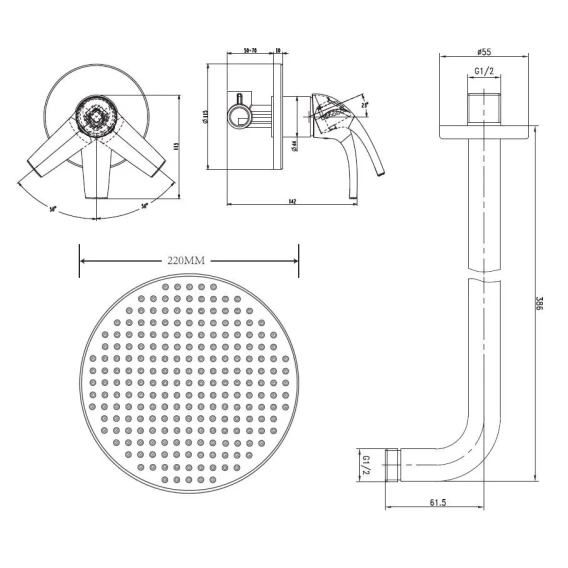 Верхний душ, Скрытая монтажная часть, Смеситель, Кронштейн